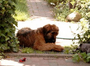 Der Briard sollte 1-2 mal in der Woche gekämmt werden. Anfangs nur zwecks Gewöhnung an die Prozedur. Eventuelles Schnappen oder Beißen nach dem Kamm oder Ihrer Hand unterbinden Sie bitte energisch, ebenso spielerisches Ausweichen. Geben Sie Ihrem Hund das Gefühl, dass das Kämmen etwas Besonderes für ihn und für Sie ist. Reden Sie liebevoll mit ihm. Er soll das Kämmen und Säubern mit Zuwendung in Verbindung bringen. Wenn er aus weicht, gibt es ein lautes “Pfui” oder “Nein”. Ist er ganz brav, wird kräftig gelobt. Beim Kämmen fangen Sie an den Pfoten an und arbeiten Sie sich dann Lage für Lage nach oben durch. Die Kontrolle der Ohren sollte jeweils mit der Fellpflege vorgenommen werden. Ohrenschütteln, Schiefhalten des Kopfes, gerötete Ohrmuscheln deuten immer auf eine Erkrankung hin (evt. auch Fremdkörper).